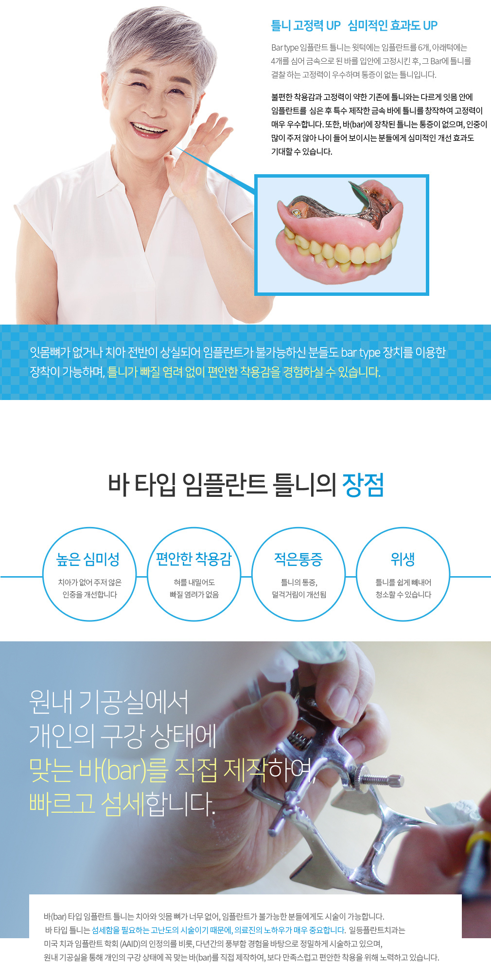 특수 제작한 Bar type 장치를 잇몸 안에 고정하여 기존 틀니의