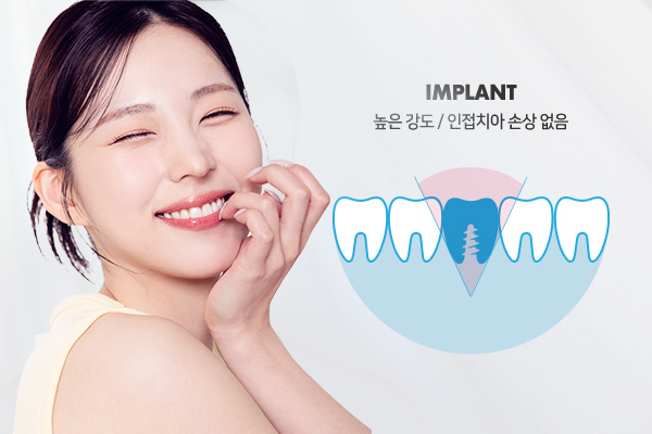 치아가 빠진 자리는 단순히 심미적인 문제가 아닌 기능적인 문제를 야기합니다. 빈 공간을 방치하지 않기 위해서 여러 방법을 선택하게 되는데 임플란트는 치아와 구조가 동일하며 잇몸 뼈에 식립 하기 때문에 단순히 치아에 걸어두는 브릿지 보다 강도가 크며 인접치아를 손상시키지 않습니다. 하지만 수술에 시간이 걸리고, 잇몸 뼈가 소실되어 임플란트 수술이 어렵다면 부가적으로 잇몸 뼈 이식을 해야 할 수 있습니다.