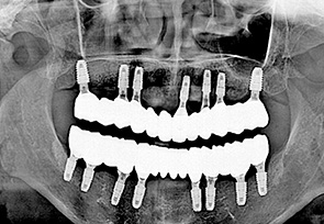 전악 임플란트는 치아가 완전히 없는 상태라도 잇몸뼈가 남아 있다면 임플란트를 여러개 심어 고정식으로 이를 해 넣을 수 있습니다. 잇몸 뼈에 단단히 고정되는 임플란트를 이용한 치료법으로 틀니를 사용할 때 보다 힘이 훨씬 좋고 내 치아 처럼 사용할 수 있습니다. 자연치아는 모두 28개 이지만 실직적으로 자연치아 개수만큼 다 심을 필요는 없습니다. 고정성 전악 임플란트를 위해서는 위 아래 턱 뼈와 맞물리게 되는 치아의 상태와 잇몸 뼈의 상태 등을 고려하여 임플란트를 식립하게 되며 보통 아래는 6~7개, 위에는 7~8개의 임플란트를 식립한 후 고정식으로 보철물을 결합하게 됩니다.