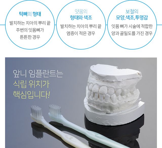 앞니가 상실되어 임플란트를 식립하는 경우 단순 임플란트 식립에 그치는 것이 아니라 잇몸의 형태, 색조, 자연치와의 자연스런 조화 등 심미적인 부분이 만족스러워야 합니다.