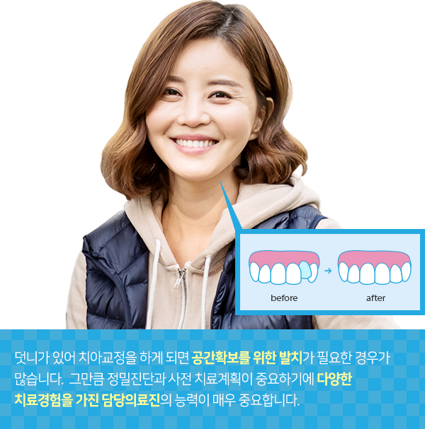 발치를 해야 하시는 분들과 비발치 치아교정이 가능하신 분들이 나누어 집니다. 환자 개인의 상태를 보고 발치와 비발치 교정 여부를 결정할 수 있습니다. 덧니의 발치 기준은 학술적으로 약 8mm 정도의 공간이 부족할 때입니다.