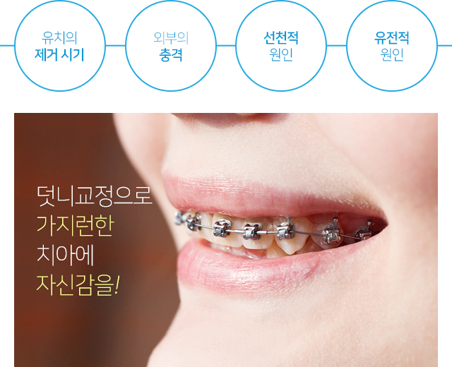 과거에는 덧니가 귀여움의 상징이었지만 구강건강에는 도움이 되지 않아 구강질환을 유발하고 저작운동 장애요소가 더 큰 질환으로 이어질 수 있어 교정을 통해 가지런한 이로 바꾸어 주는 것이 좋습니다.