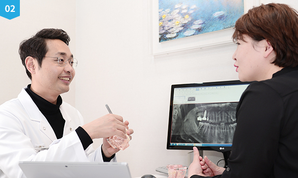 현재 치아의 상태를 정확하게 검진하는 것이 매우 중요합니다. 치아가 소실 된 시간이 오래될 수록 잇몸 뼈의 소실량이 많아지기 때문에 임플란트를 식립할 수 있는 잇몸뼈의 양과 질을 철저하게 분석하는 것이 매우 중요합니다.