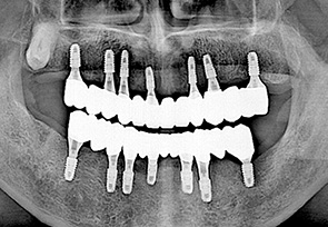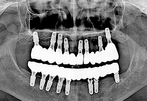 전악 임플란트는 치아가 완전히 없는 상태라도 잇몸뼈가 남아 있다면 임플란트를 여러개 심어 고정식으로 이를 해 넣을 수 있습니다. 잇몸 뼈에 단단히 고정되는 임플란트를 이용한 치료법으로 틀니를 사용할 때 보다 힘이 훨씬 좋고 내 치아 처럼 사용할 수 있습니다. 자연치아는 모두 28개 이지만 실직적으로 자연치아 개수만큼 다 심을 필요는 없습니다. 고정성 전악 임플란트를 위해서는 위 아래 턱 뼈와 맞물리게 되는 치아의 상태와 잇몸 뼈의 상태 등을 고려하여 임플란트를 식립하게 되며 보통 아래는 6~7개, 위에는 7~8개의 임플란트를 식립한 후 고정식으로 보철물을 결합하게 됩니다.