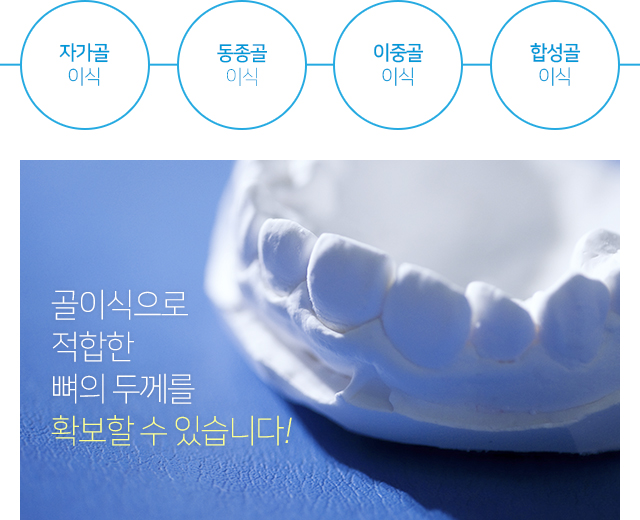 시술 대상자 본인의 뼈를 사용하여 이식을 합니다. 발치한 치아, 사랑니 또는 하악골의 뼈를 사용하여 이식을 진행하며 본인 뼈를 이용한 시술이기에 신체거부반응이나 감염의 위험이 적은 것이 가장 큰 장점입니다. 자가골이 부족한 경우에 인조골(동종골, 이종골, 합성골)과 혼합하여 사용하기도 합니다.