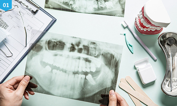 현재 치아의 상태를 정확하게 검진하는 것이 매우 중요합니다. 치아가 소실 된 시간이 오래될 수록 잇몸 뼈의 소실량이 많아지기 때문에 임플란트를 식립할 수 있는 잇몸뼈의 양과 질을 철저하게 분석하는 것이 매우 중요합니다.