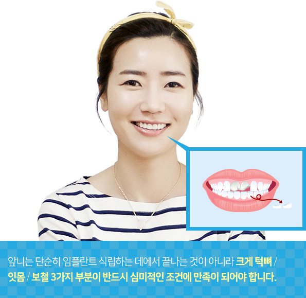 앞니가 상실되어 임플란트를 식립하는 경우 단순 임플란트 식립에 그치는 것이 아니라 잇몸의 형태, 색조, 자연치와의 자연스런 조화 등 심미적인 부분이 만족스러워야 합니다.