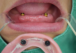 각각의 유지 장치에 맞는 부속품을 틀니에 부착한 후 틀니를 구강 내에 장착합니다. 틀니에 부착된 부속품이 유지 장치와 결합하여 틀니를 고정해 주기 때문에 말을 하거나, 식사를 할 때 틀니가 빠지지 않습니다.