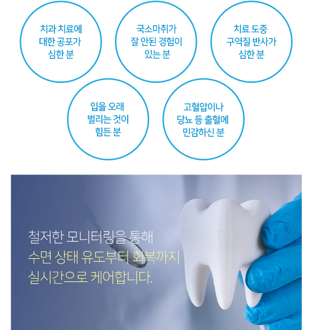 또한, 수술 이후에도 치료 과정에 대한 기억이 남지 않아 치과에 대한 공포감을 가지신 분들도 편안하게 치료를 받으실 수 있습니다.