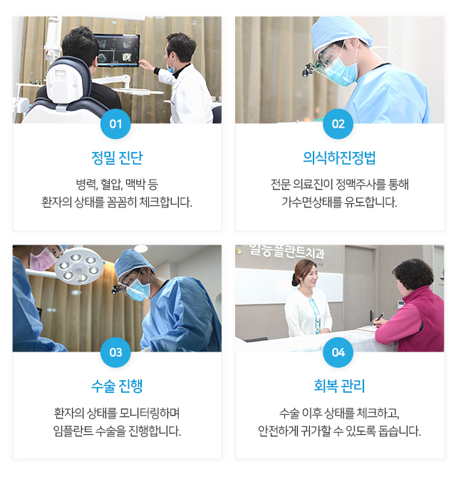 일등플란트치과는 정량 약물 주입기를 사용하여 수면 상태를 일정하게 유지하며 환자가 중간에 깰 걱정 없이 시술이 가능합니다. 또한 시술 후 대부분은 통증이나 기억에 대한 부담 없이 깨어나 치과 공포증이 있는 분들도 만족도가 높습니다.