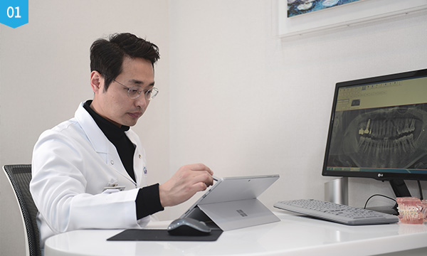 의식하진정법 하에 진행될 임플란트의 개수, 일정 등 정밀 진단 분석 자료를 토대로 환자 개인에게 맞춘 치료 계획을 수립하여 임플란트를 식립합니다.